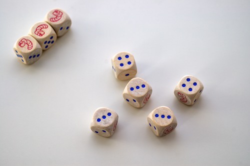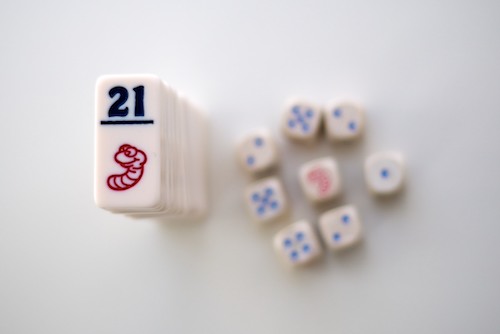 En primer lugar, los ocho dados tienen los valores 1, 2, 3, 4, 5 y gusanito. No hay 6, sino un dibujo de un gusano, que cuenta como cinco puntos.